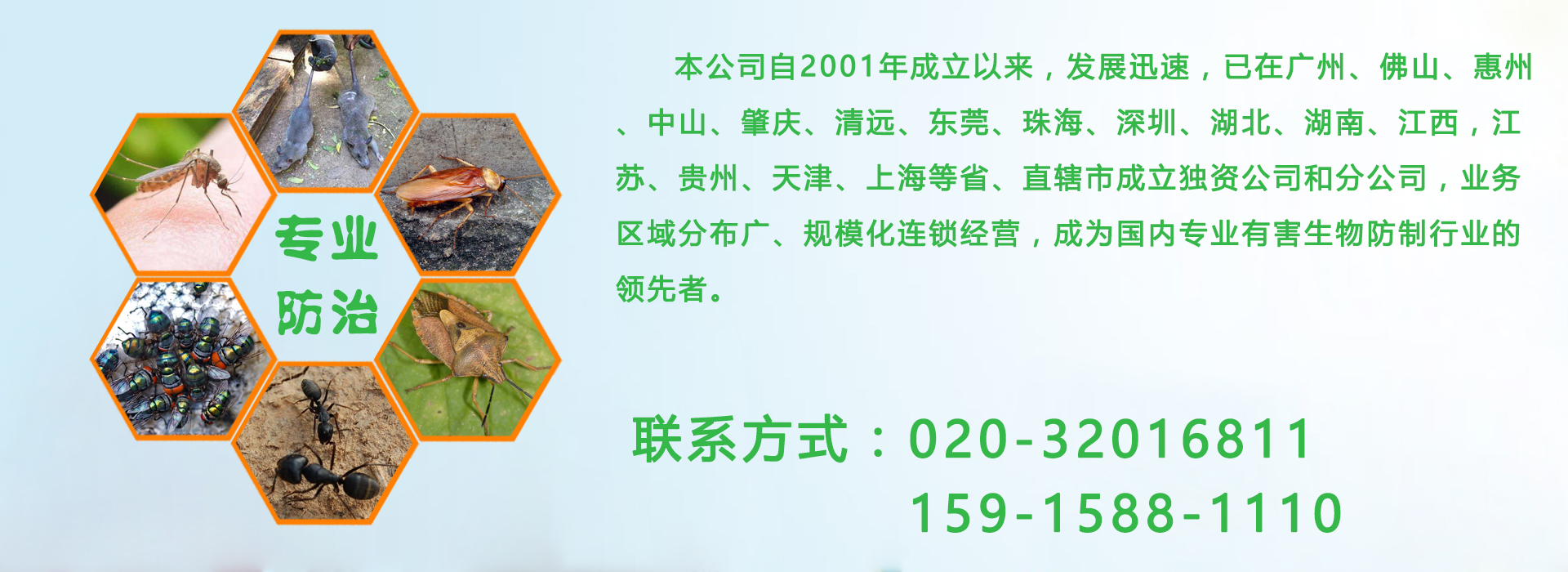 廣州億康環(huán)境科技有限公司專業(yè)從事有害生物防制、空氣治理、增香除味、清洗保潔、衛(wèi)生防疫消毒。本公司自成立以來(lái),發(fā)展迅速,業(yè)務(wù)區(qū)域分布廣、規(guī)模化連鎖經(jīng)營(yíng),成為國(guó)內(nèi)專業(yè)有害生物防制行業(yè)的領(lǐng)先者。